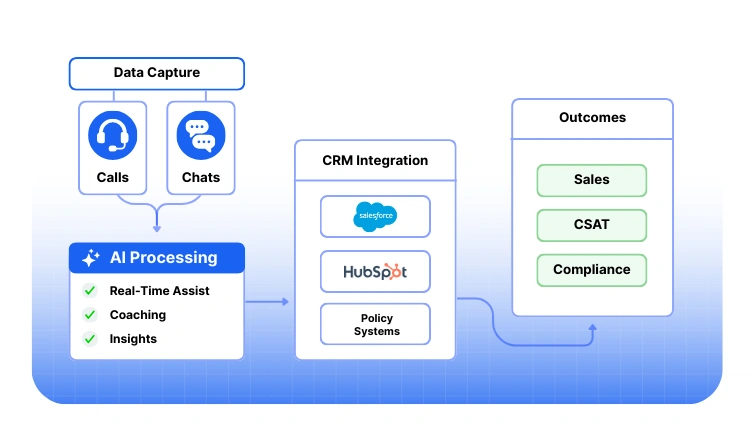 - Prompting & decisioning: AI must be able to pop alerts, guidance, or suggestions inline for agents.