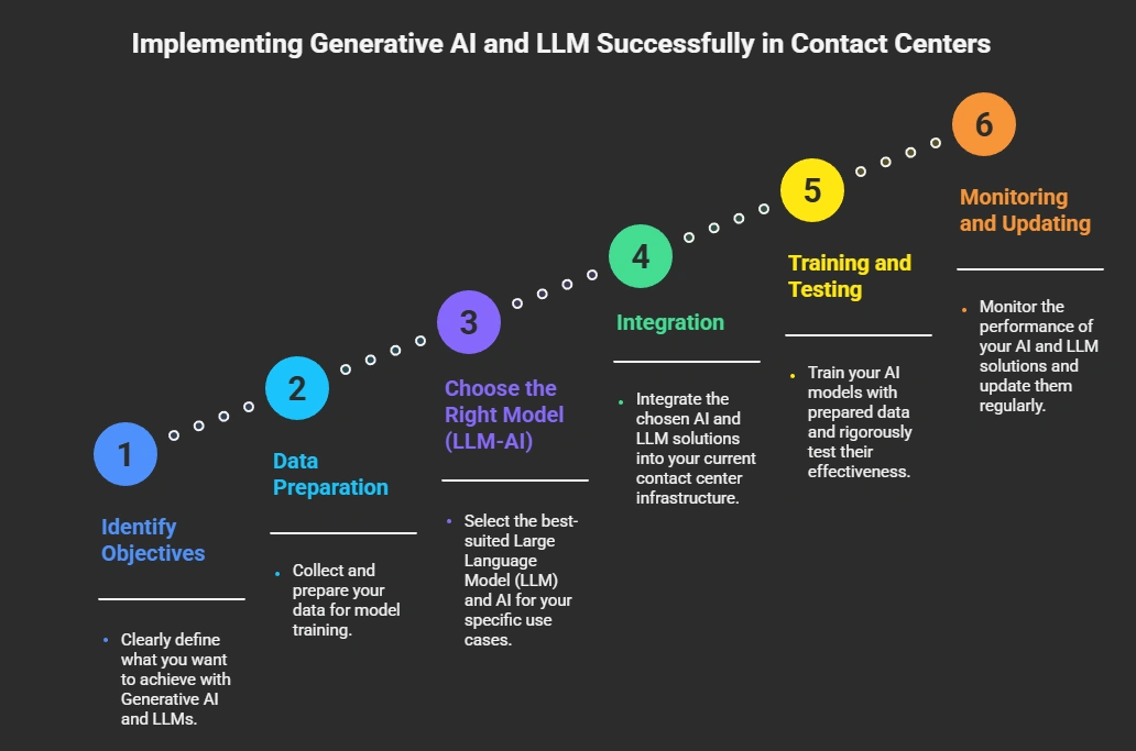 By focusing on these steps and adapting the approach to specific industry needs, call centers can leverage the power of Generative AI and LLMs to significantly enhance their efficiency, customer satisfaction, and operational outcomes.