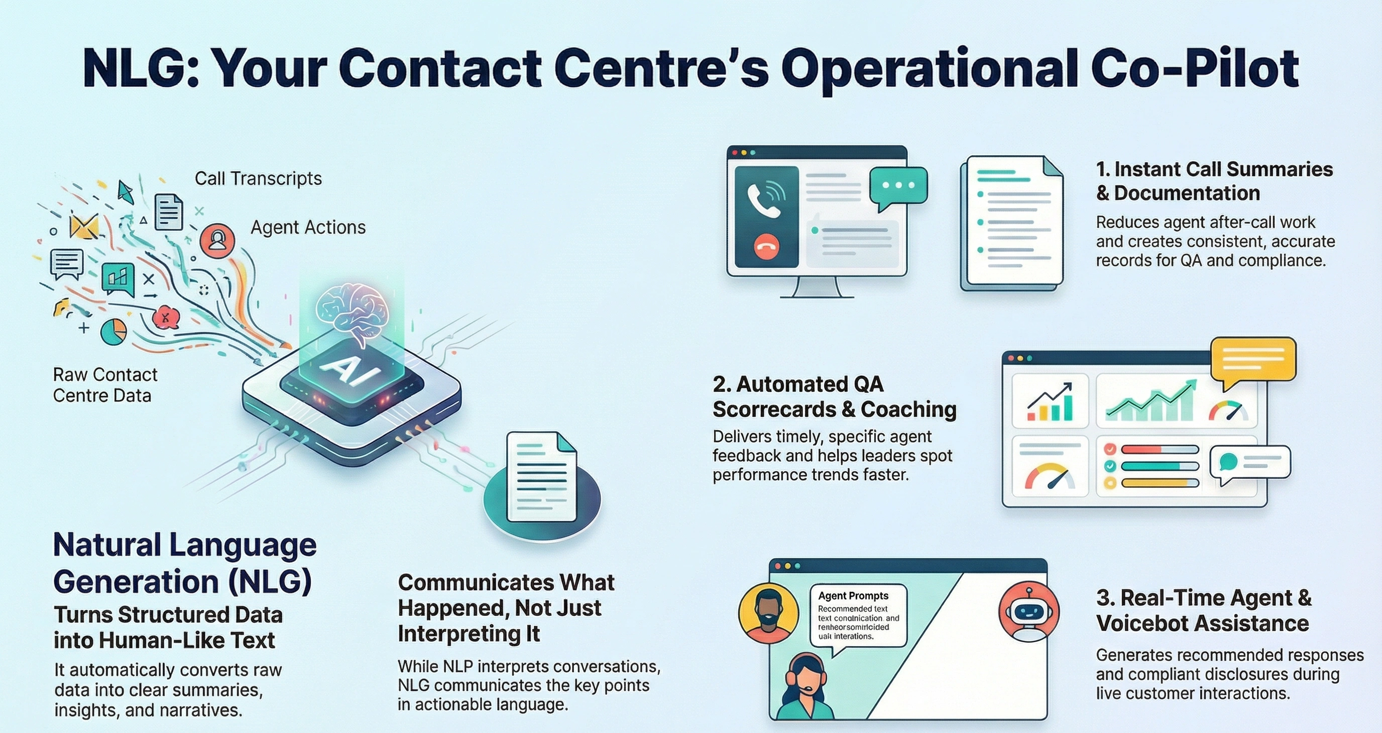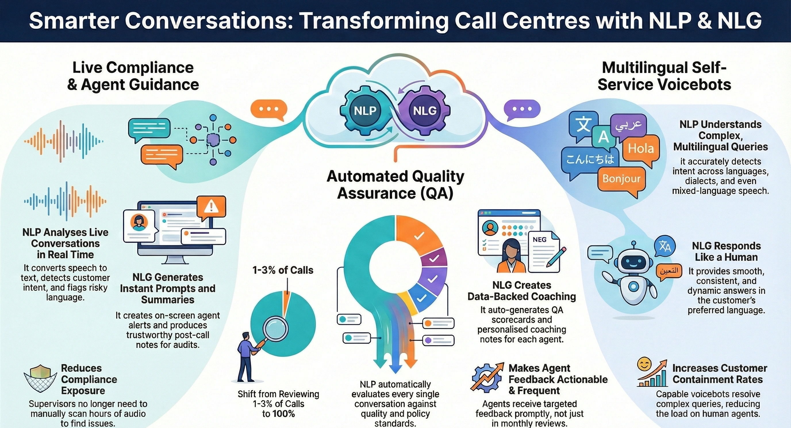 NLG and NLP are reshaping contact centers through automating summaries, QA, compliance, and multilingual support, while strengthening natural language processing in call center operations.