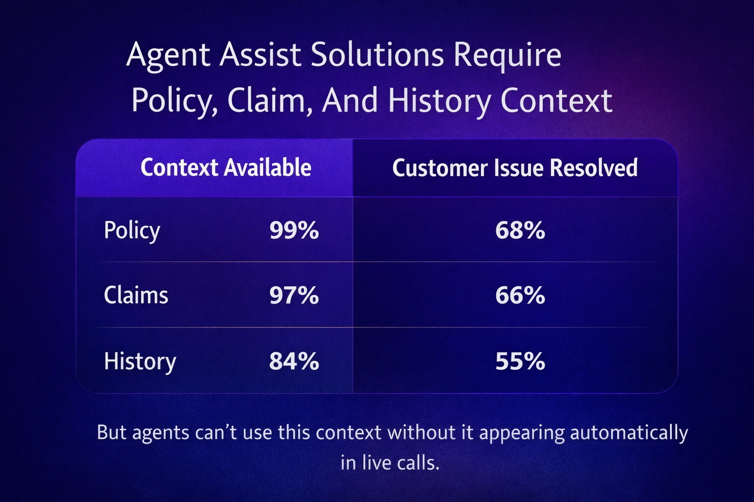 Policy and claim context transform real-time agent assist from a script reader into a decision support system.
