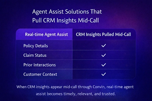 When CRM insights appear mid-call through Convin, real-time agent assist becomes timely, relevant, and trusted.