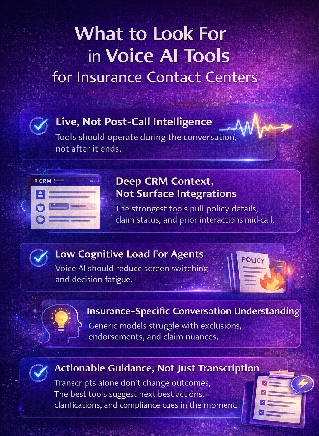 Voice AI should reduce screen switching and decision fatigue. If agents must click, search, or interpret alerts, adoption will stall. - Insurance-Specific Conversation Understanding
