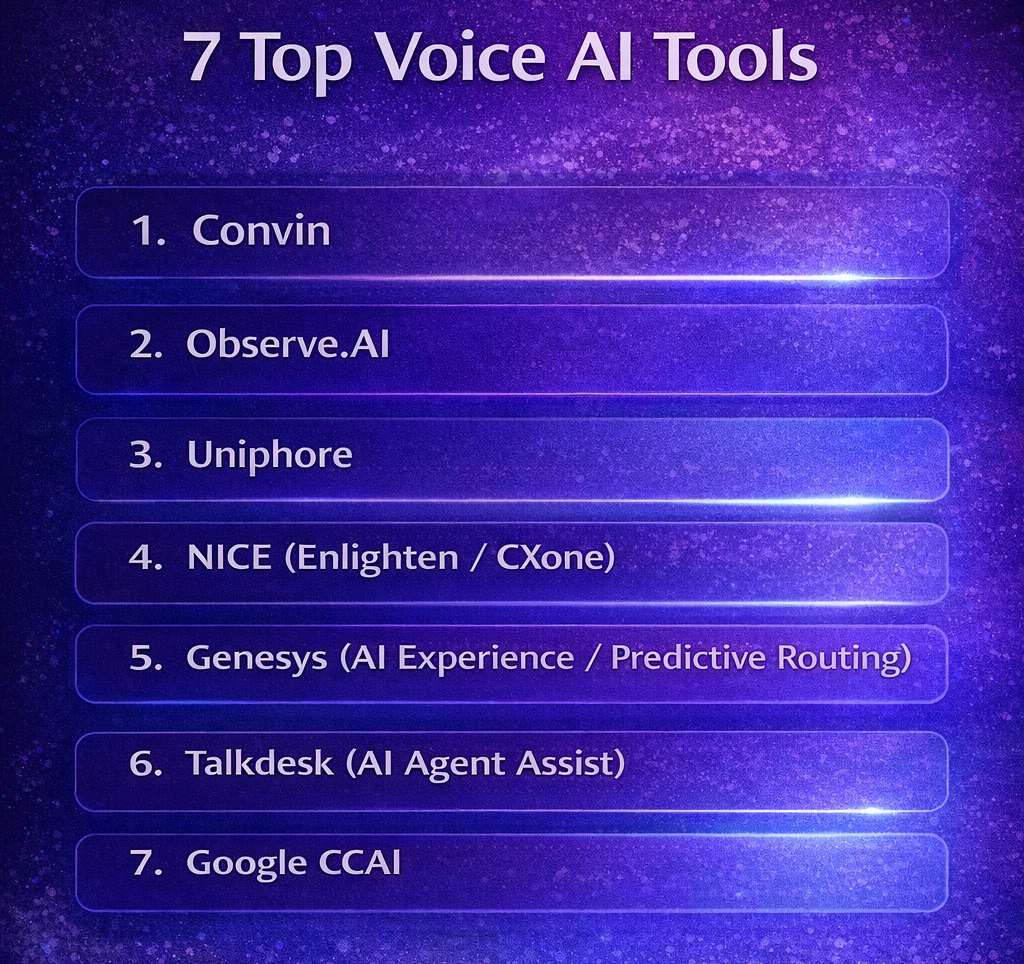 Once teams understand what to look for, the next natural step is to see how the 7 Top voice AI tools stack up against those criteria. The goal here isn’t to crown a winner, but to highlight strengths, gaps, and best-fit use cases, especially for insurance contact centers.