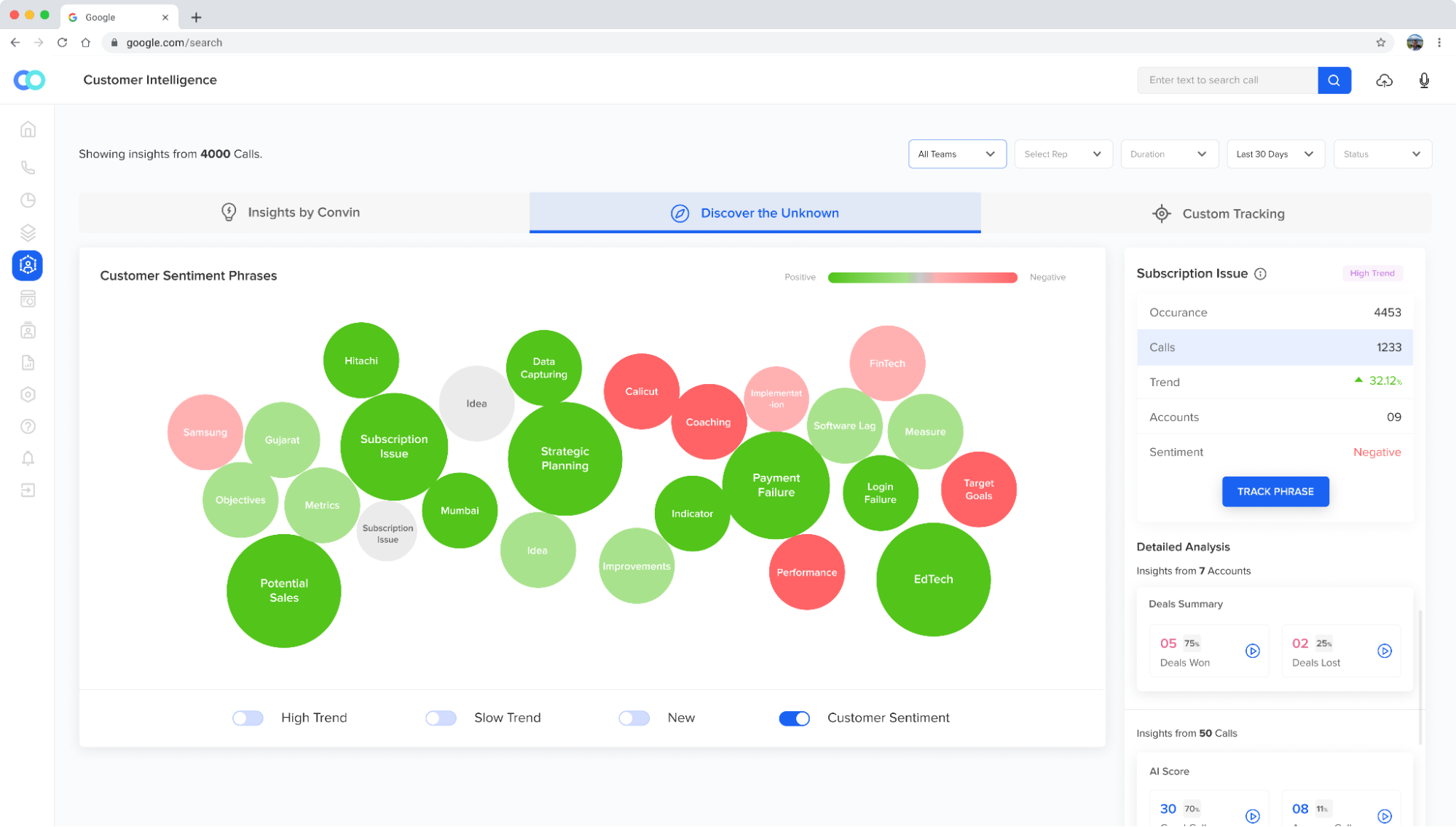 Convin’s customer intelligence tool allows users to track keywords and behaviors that can be picked up and repeated to close more deals in a shorter time.