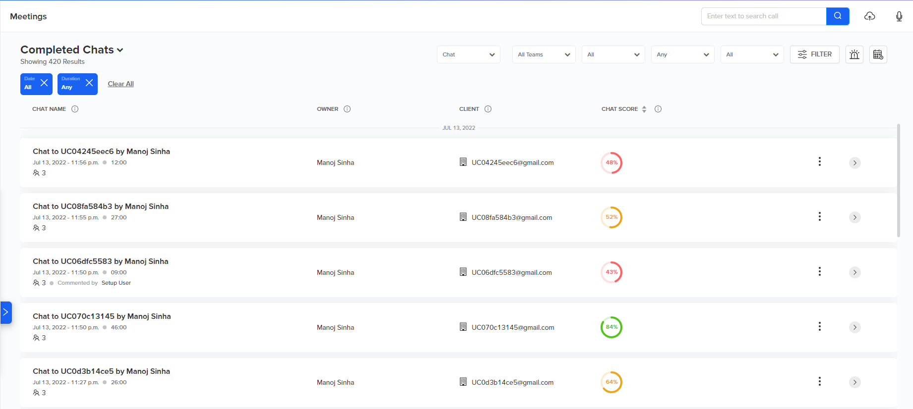 - You’ll now have an extensive list of chats/emails recorded by Convin, and you can narrow your search down to specific chats/emails that you or the audit team would like to focus on.