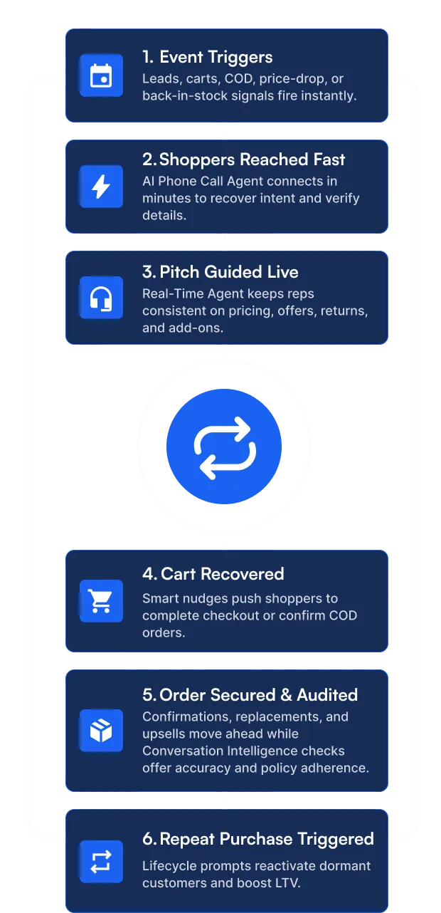 AI Phone call reaches shoppers in minutes, Real time agent keeps the pitch on track, and conversation intelligence makes every interaction reviewable and repeatable.