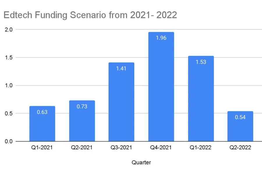India's funding landscape has been declining since the start of the year. To understand this further, let’s look at the following graph that analyzes the funding scenario from 2021 to 2022 based on the total funding amount of Edtech startups in India across the quarters.
