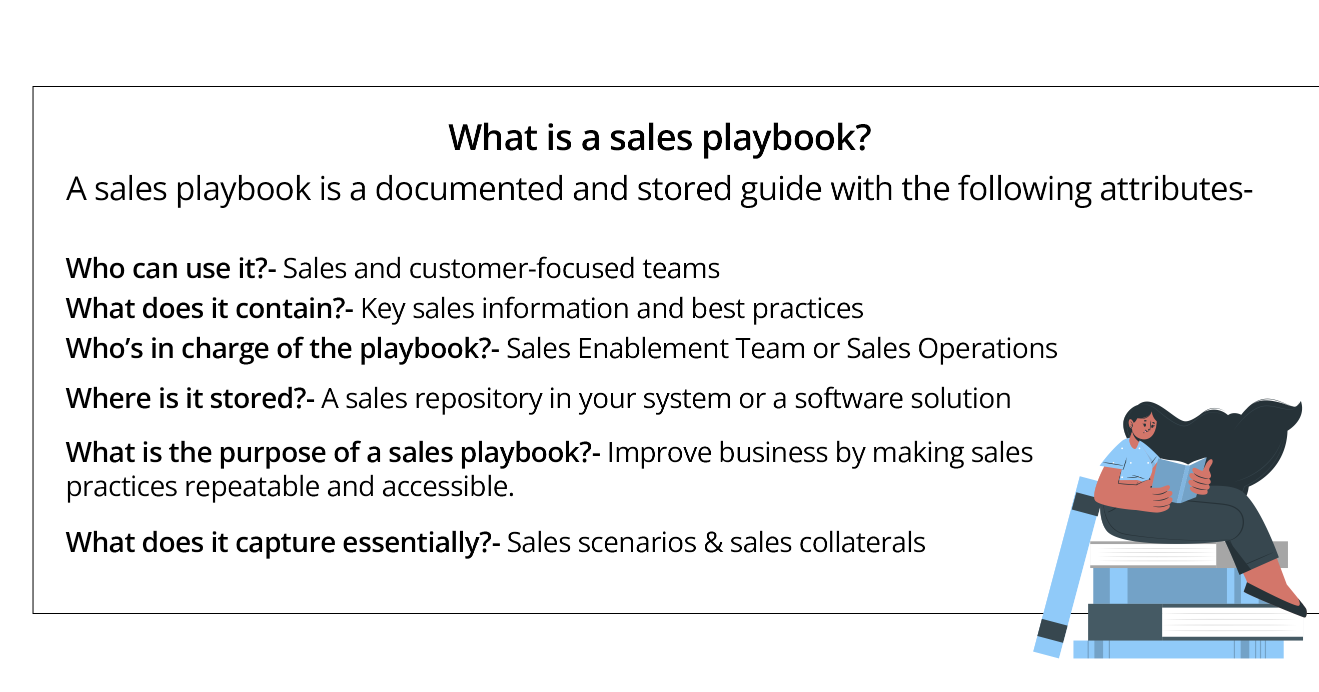 What is the purpose of a sales playbook?- Improve business by making sales practices repeatable and accessible.